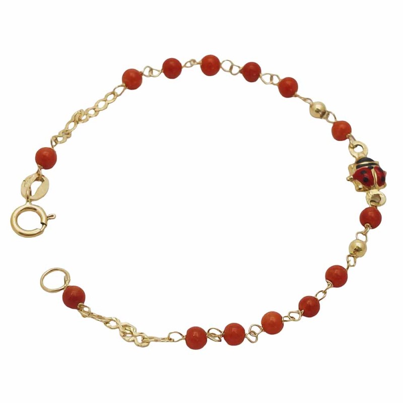 Bracciale neonato in Oro giallo 18Kt di gr 0,92 con coccinella smaltata e coralli rossi portafortuna del diametro di 2,6 mm