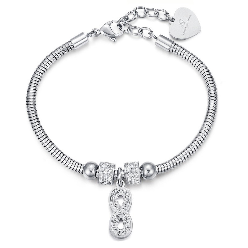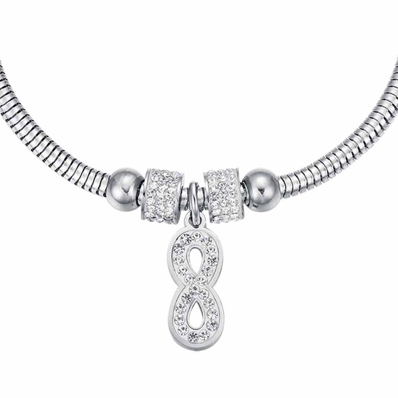 Il bracciale in acciaio con simbolo dell'infinito pendente e tempestato di cristalli bianchi è un accessorio luminoso ed elegante. Si tratta di un gioiello all'ultima moda che propone un design al passo con i tempi. La catena modello snake permette di aggiungere charm speciali, il pendente ha un significato unico. Il gioiello è un'idea regalo perfetta per le donne che amano i gioielli luminosi e appariscenti che non passano inosservati.