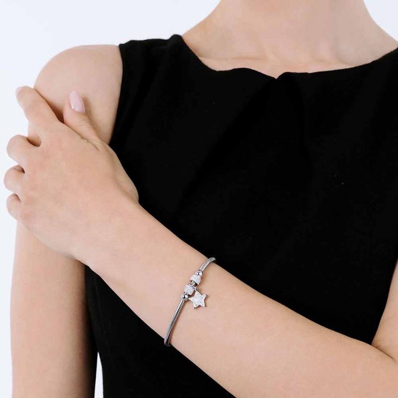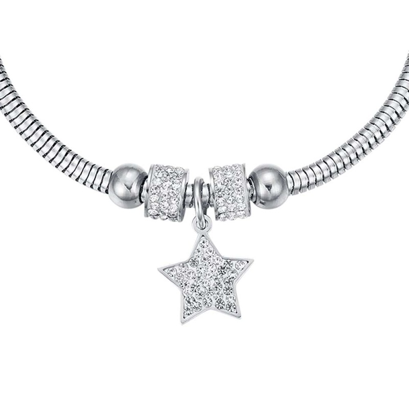 Il bracciale in acciaio modello snake con stella pendente tempestata di cristalli bianchi è un accessorio alla moda e femminile. Perfetto per far risplendere qualsiasi look, questo gioiello regala un tocco chic grazie alla moltitudine di cristalli bianchi e luminosi. Accessorio alla moda e intrigante è un'idea regalo d rara bellezza, perfetta per chi ama i gioiello brillanti che non passano mai di moda.