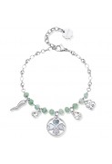 Bracciale in Acciaio 316L anallergico con calcedonio colore verde, pendenti a forma di quadrifoglio con madreperla verde, cornetto, quadrifoglio e cristalli