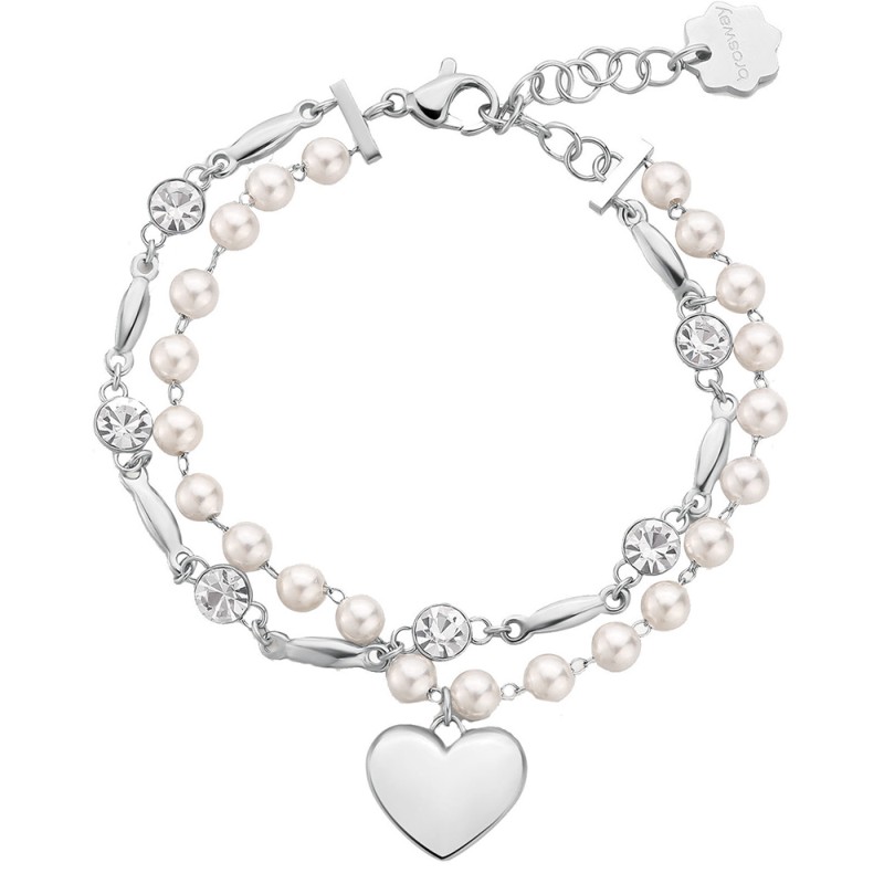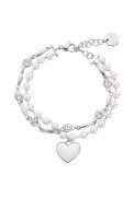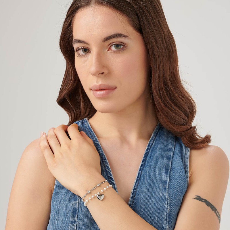 Bracciale semirigido doppio filo in acciaio 316L, con pendente a forma di cuore, perle di conchiglia e cristalli