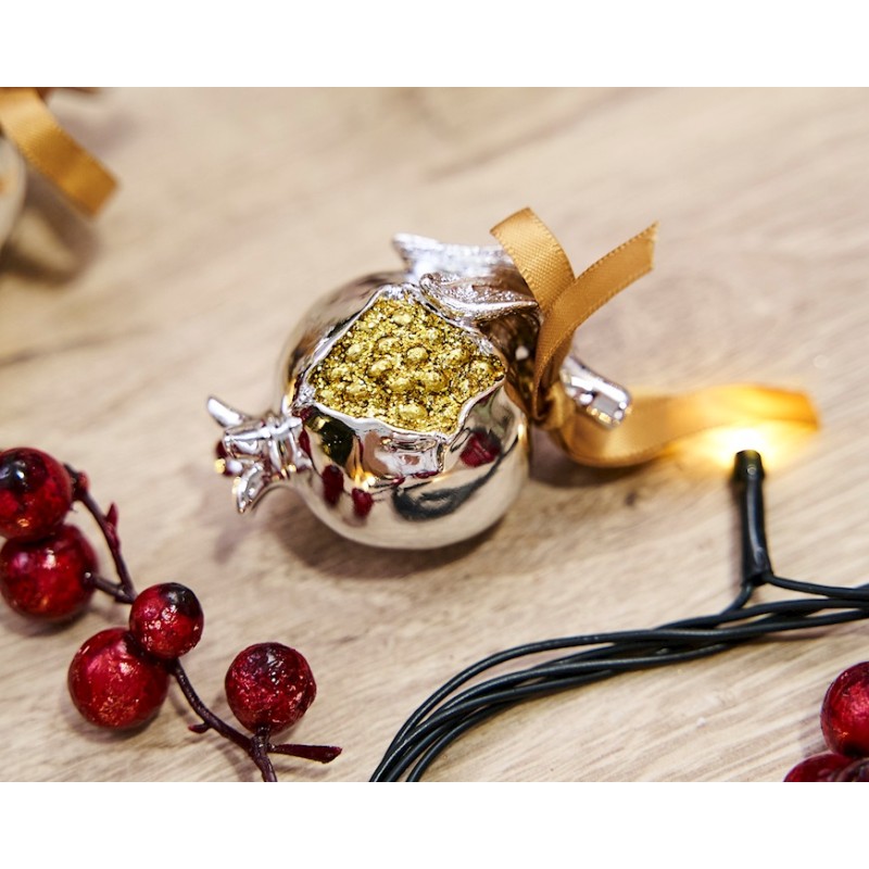Melagrana portafortuna in resina placcata argento con glitter oro