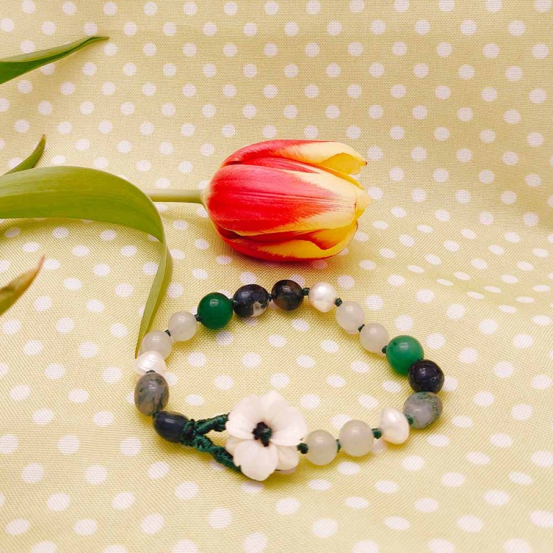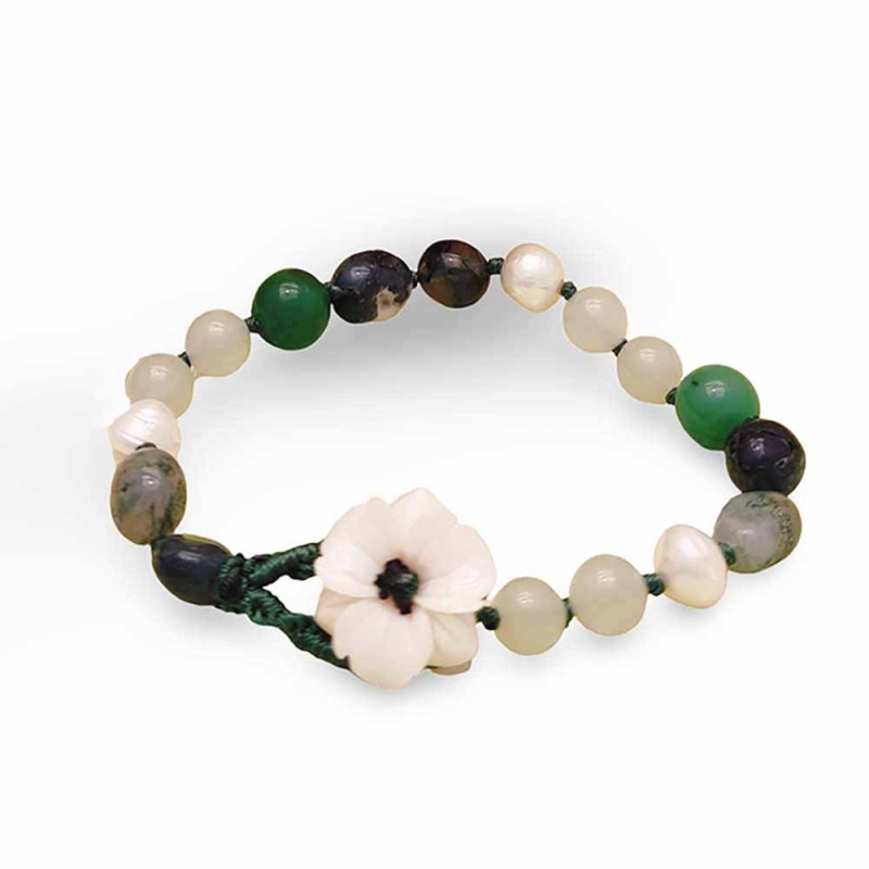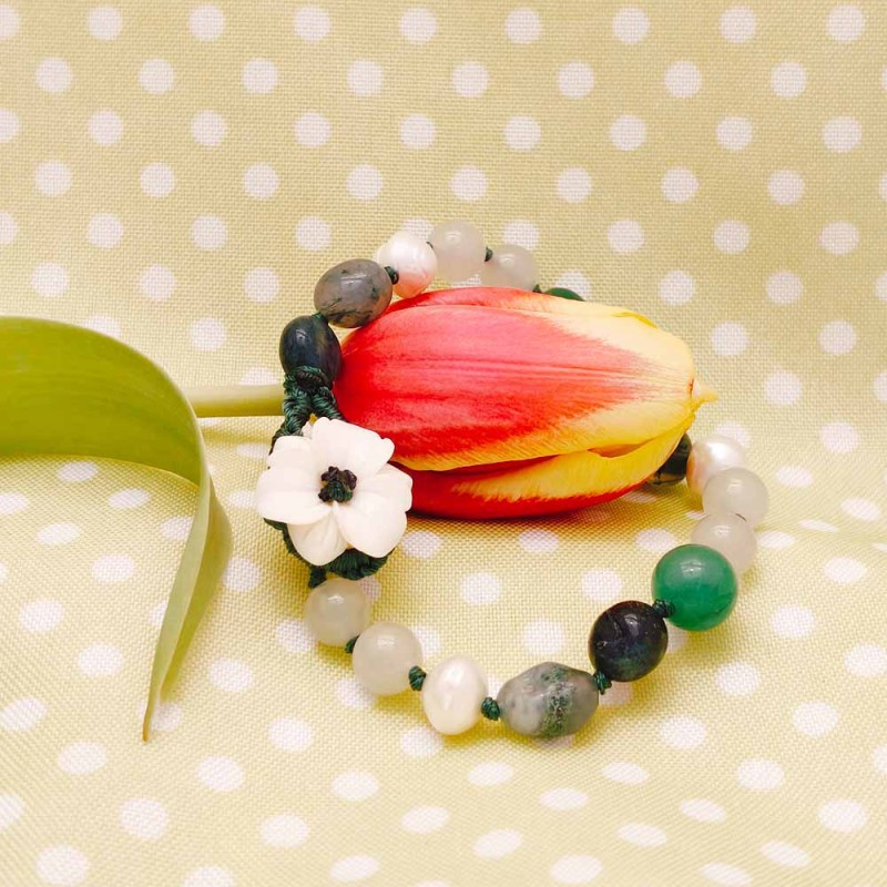Bracciale realizzato con pietre naturali mix nei toni del verde e perle bianche barocche freshwater